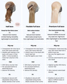 Hvad angår vores halvblondeparykker, er de lavet med HD-blonde kun i den forreste del af parykkappen og fra øre til øre. Håret bindes i hånden kun i den forreste del af parykkens blonde, mens resten af parykkens hætte er maskinsyede islæt. Halvblondeparykker giver en naturlig hårgrænse foran og giver dig mulighed for at skifte skilning eller have pandehår, præcis som om det var dit eget hår. Stylingmulighederne kan være lidt mere begrænsede end med fuldblondeparykker, fordi resten af parykbasen ikke er lige så alsidig. Valget mellem fuldblonde og halvblonde afhænger af dine præferencer og stylingbehov.