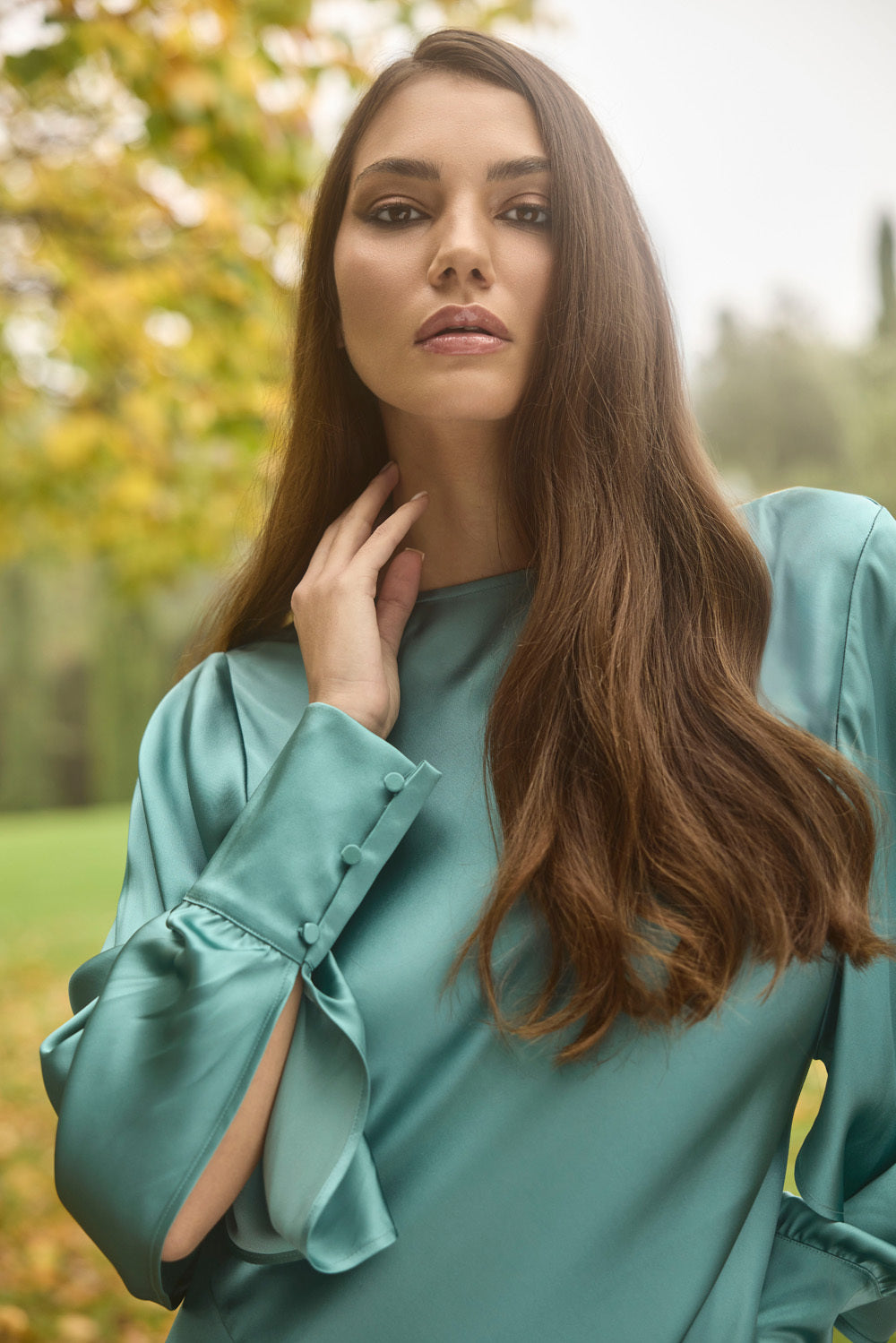 Woman in long, curly brown hair wearing BHBD hair extensions.